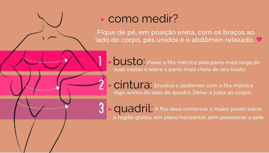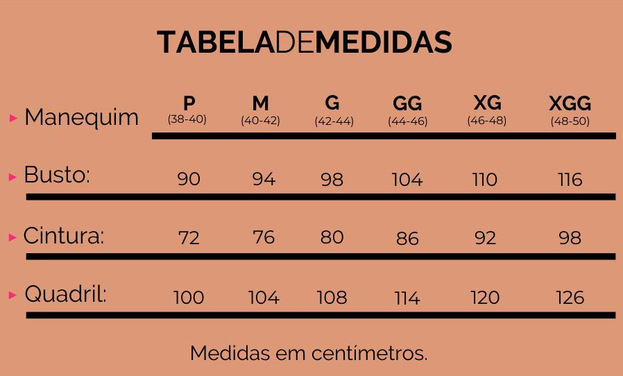 Consulte nossa tabela de medidas para escolher o tamanho ideal comparando com suas roupas ou lingeries habituais, garantindo conforto e caimento perfeito.