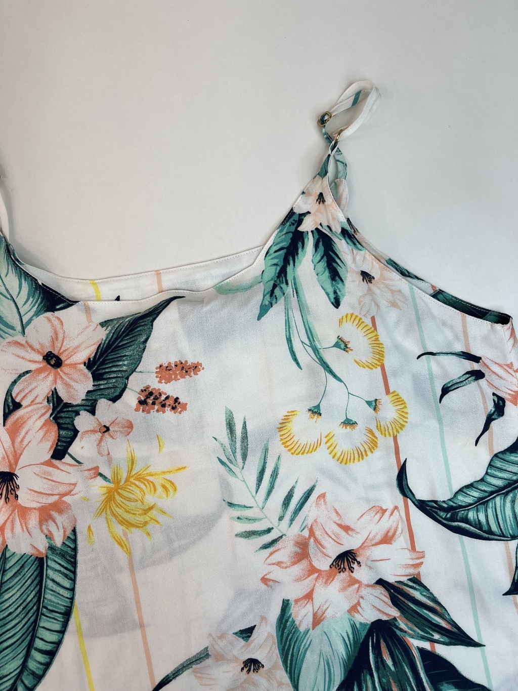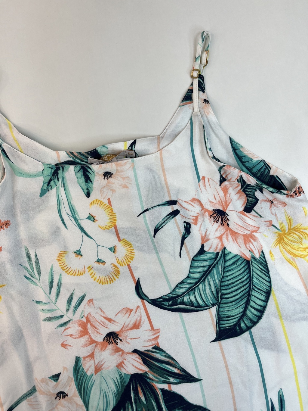 Confeccionada em 100% viscose, esta regata apresenta um corte redondo e alças finas com regulagem, permitindo um ajuste perfeito ao seu corpo. A estampa florida, com fundo predominantemente branco, traz um toque de frescor e vivacidade, ideal para quem deseja se destacar com um visual descontraído e moderno.
